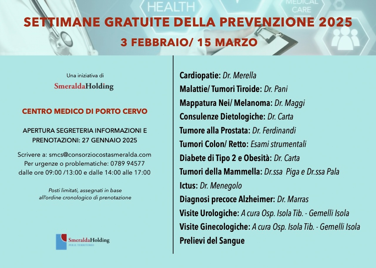 Dopo gli ottimi numeri dell’edizione 2024 – con oltre 560 visite effettuate e un programma esteso da 40 a 72 giornate – Smeralda Holding, la società italiana interamente controllata da Qatar Investment Authority (“QIA”) e proprietaria dal 2012 di immobili e terreni sul mare lungo la destinazione Costa Smeralda®, ha annunciato al quarta edizione delle “Settimane gratuite della Prevenzione”. Un appuntamento che si svolgerà dal 1 febbraio al 15 marzo 2025, presso l’ambulatorio del Centro Medico di Porto Cervo, in via Aga Khan. Cittadini e residenti potranno effettuare visite mediche specialistiche gratuite al fine di prevenire l’eventuale insorgenza di malattie o individuare possibili fattori di rischio.